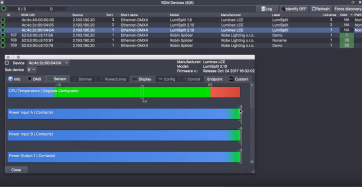 ‘Get Command’는 장비로 부터 각종 정보를 읽어 들여오는 것을 말합니다. 장비의 제조사와 제품정보에서 부터 DMX Adress, UID, 네트워크 정보, Universe, 램프 관련정보, 그리고 온도센스와 같은 장비에 대한 대부분의 정보를 받아볼 수 있습니다. 또한 장비의 네트워크 상태를 바로 볼 수 있고 이상이 생겼을 경우 에러 메세지와 로그파일을 받아볼 수 있습니다.