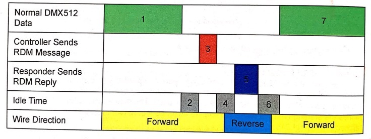RDM 프로토콜은 DMX신호와 같은 라인을 통해서 데이터를 주고 받습니다. 동시에 DMX와 RDM신호를 주고 받는 것이 아니라 DMX신호를 주고 받는 사이에 RDM데이터를 끼워넣는 방식입니다. 아래 그림과 같이 DMX 신호가 끝나면 ‘Idle Time’을 보내 고 콘솔에서 장비에게 RDM 메세지를 보냅니다. 마찬가지로 RDM 데이터를 주고 받는 사이에도 ‘Idle Time’을 삽입하여 구분하여 줍니다. RDM데이터가 끝나면 다시 DMX 신호가 계속 전달됩니다. 아주 복잡할 것 같지만 RDM 데이터 패킷은 DMX512신호에 비해서 아주 작은 데이터로 전체 대역폭의 3%정도를 차지합니다.