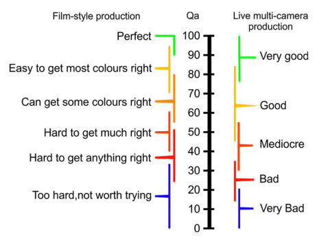 2012년 EBU(유럽방송연맹) 기술위원회는 텔레비젼 방송환경에서 새로운 조명기기의 품질을 측정할 수 있도록 디자인된 새로운 권고를 제안했습니다. EBU내 LED Lighting Project Group는 영화방송 제작에 고효율의 LED장비를 선택하는 것을 돕고, 텔레비젼 분야에 적합하지 않은 CRI를 대체하는 측정방법을 개발했습니다. 카메라가 빛을 해석하는 방식이 사람이 인식하는 것과 다르기 때문에 TLCI는 방송용 광원의 색상 충실도를 정확하게 측정하는 방법을 제공합니다.