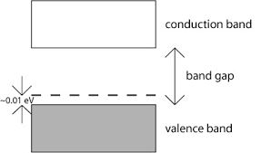 아래쪽 밴드에 있는 전자가 에너지를 얻어 위쪽의 에너지 밴드로 이동하면 아래쪽 에너지 밴드에는 정공(hole)이 생깁니다. 아래의 에너지 밴드에서 전자가 에너지를 얻어 올라올 수 있는 위쪽의 에너지 밴드를 전도대(conduction band)라 부르고 아래쪽에 전자의 에너지 상태가 존재하는 밴드를 가전자대(valence band)라고 합니다. 이 때 전도대의 최소 에너지 값과 가전자대의 최대 에너지 차이가 에너지 갭이 됩니다