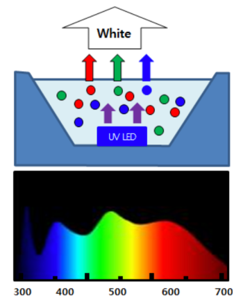 세 번째 방법은 UV LED와 적색,녹색,청색 형광체를 사용하여 백색광을 만들어 내는 방법입니다. 이 방식은 3파장 형광등의 원리와 동일한 방법으로 자외선을 발광하는 LED로 RGB 색상의 형광체를 비추어 백색광을 만들어 냅니다. 백열전구와 같은 넓은 스펙트럼 특성을 가질 뿐 아니라 높은 CRI를 확보할 수 있습니다. CCT(상관색온도)나 CRI(연색성 평가지수)룰 쉽게 조절할 수 있다는 장점이 있습니다. 현재 White LED를 만드는 방법 중 가장 우수한 방법으로 각광받고 있습니다. 하지만 UV LED로 적색,녹색,청색 형광체를 모두 비추어 빛을 얻기 때문에 츨력이 약한 단점이 있습니다. 앞으로 츨력을 높이기 위한 형광체 개발이 이루어지면 좋은 품질의 White LED 장비를 기대할 수 있을 것 같습니다.