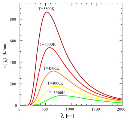 플랑크의 흑체복사에서 조명에서 사용하는 “색온도”라는 개념이 나왔습니다. 흑체복사 스펙트럼은 흑체의 온도가 올라갈수록 주파수가 커지고 파장이 짧아지면서 복사에너지는 커지는 특성을 가집니다. 이때 광원의 색을 절대온도를 이용해서 숫자로 표시한 것이 색온도입니다.