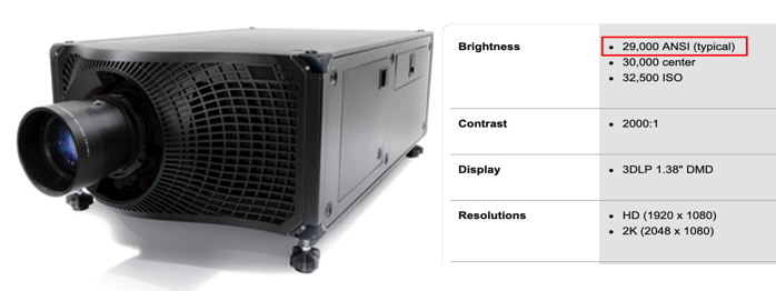 빔 프로젝트는 Lumen과는 다르게 ANSI Lumen이라는 단위를 사용합니다. ANSI는 미국 국제 표준협회(American National Standards Institute)의 약자입니다. ANSI Lumen은 1992년에 빔프로젝트의 밝기를 나타내는 단위로 만들어졌습니다. 프로젝트를 40인치 크기로 투사해서 스크린상의 백색 화면을 9개의 동일한 직사각형으로 나눈 뒤 밝기를 평균하여 측정합니다. Lumen은 단순히 램프 자체의 밝기만 나타낼 수 있고 실제 멀리 떨어진 스크린에 투사되는 밝기를 나타낼 수가 없어 프로젝트의 정확한 밝기를 비교하기 위해서는 ANSI Lumen을 확인해야 합니다. 일부 업체에서 보다 높은 값이 나오는 Lumen을 표시하는 경우가 있으니 주의해서 비교해야겠습니다.