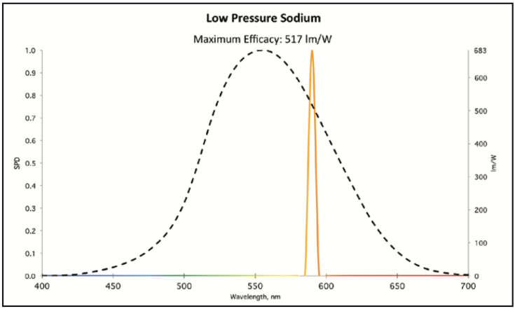 지금까지는 단색광원의 파장에 따른 Efficacy에 대해서 이야기해보았습니다. 하지만 현실에서 우리가 사용하는 대부분의 광원은 다양한 파장대의 빛이 섞여있는 넓은 스펙트럼을 가진 것이 대부분입니다. 이런 광원들의 Efficacy를 구하기 위해서는 개별적인 파장으로 나누어 구하고 합한 값으로 나타낼 수 있습니다. 일상 생활에서 많이 사용하는 여러가지 광원의 파장과 lm/W를 살펴 보겠습니다. 우선 가로등으로 많이 사용하는 압축수은등(low-pressure sodium light)은 아주 좁은 스펙트럼을 가지고 있어 Efficacy의 사례로 들기에 적당합니다. 아래 보시는 오렌지 색상의 파장은 517lm/W을 가집니다. 좁은 스펙트럼의 높은 Efficacy를 가지고 있어 적은 전력으로 밝은 빛을 만들어 낼 수 있습니다. 하지만 이 광원의 연색성은 생각하시는대로 좋지않습니다. 단순히 Efficacy가 높다고 좋은 광원이 될 수 없다는 좋은 사례이기도 합니다.