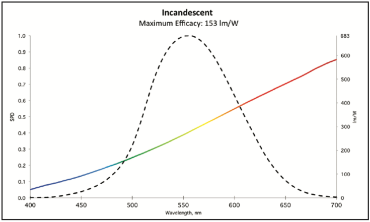 다음으로는 예전에 대부분의 가정에서 사용했던 백열등을 살펴보겠습니다. 수은등과 반대로 백열등은 아주 좋은 연색성과 넓은 스펙트럼을 가지고 있습니다. 가시광선내 모든 파장대의 빛을 골고루 가지고 있어 모든 색상을 잘 표현할 수 있지만 사람이 볼 수 없는 영역에도 많은 에너지를 발산합니다. 따라서 수은등에 비해서 상대적으로 낮은 153 lm/W Efficacy를 가지게 됩니다. 이 수치는 다른 광원으로 백열등과 똑같은 좋은 품질의 빛을 만만들어도 Efficacy는 백열등보다 좋을 수 없다는 것을 말하고 있습니다.