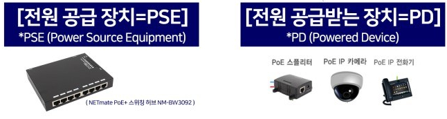 PoE는 익히 들어서 잘 알고 있는 IEEE 802.3af와 802.3at을 표준으로 하고 있습니다. PoE 기능을 사용할 수 있는 장치는 전원을 공급하는 장비, PSE(Power Sourcing Equipment)와 전원을 공급받는 장치 PD(Powered Device)가 있습니다. 때로는 두 가지 역활을 모두 하는 장치도 있습니다. 대부분의 PSE는 Switch와 같은 네트워크 장비이고, PD는 인터넷 전화기, 무선 공유기나 IP 카메라와 같은 장비를 말합니다. 특히 건물의 실외나 설치하기 힘든 곳에 두어야 하는 CCTV는 최근 PoE 기술이 적용한 제품이 많이 사용되고 있습니다.