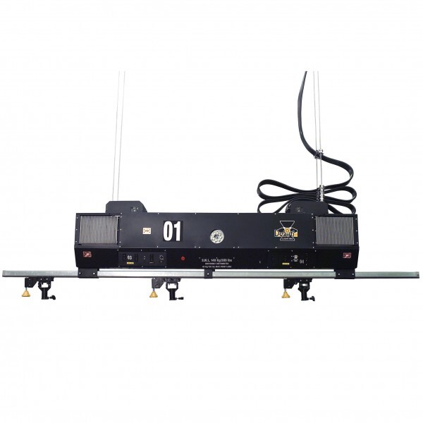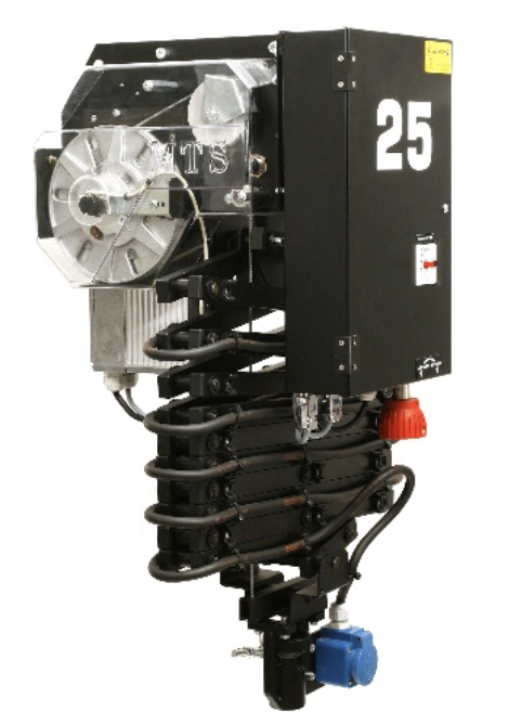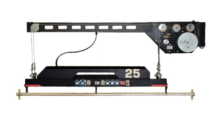 또다른 Moteried Batten System으로 Self-Climbing Hoist가 있습니다. 다른 용어로 ‘Under Grid Hoist‘라고 부릅니다. 한마디로 전원과 데이터가 설치된 Flyduct에 모터부와 와이어와 같은 구동부가 같이 포함된 시스템입니다. 스튜디오 상부에 별도의 상부 Grid가 필요하지 않고 구조물에 2개 지점을 고정하여 설치할 수 있습니다. 스튜디오 상부 공간을 줄일 수 있고 상부 Grid를 만드는 비용과 공정을 절약할 수 있는 장점이 있습니다. 또한 스튜디오 바닥에서 설비에 대한 유지보수나 다양한 작업을 진행할 수 있습니다. 하지만 Hoist에 모터부와 와이어의 자체 하중을 포함하기 때문에 무겁고 많은 조명장비를 설치하는데 적합하지 않습니다.