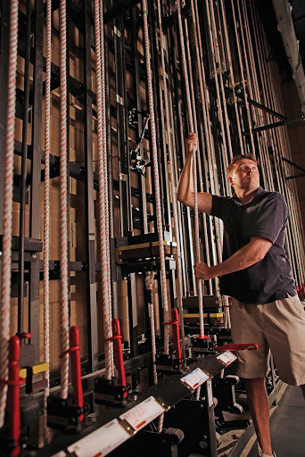 고정식 조명설비는 사다리를 사용해서 장비 하나하나를 설치할 수 있습니다. 많은 시간과 노력이 들 수 밖에 없습니다. 또한 높낮이를 조정할 수 없는건 가장 큰 단점입니다. 한번에 많은 장비를 원하는 높이에 올려두기 위해서는 고정식보다 좀더 복잡한 설비가 필요합니다. 그런 설비 중에 간단한 것이 ‘Counterweight System’입니다. ‘Counter Weight’는 사전적인 의미로 균형추를 의미합니다. 이 시스템을 간단하게 설명하자면 긴 파이프에 조명장비를 설치하고 높이를 조절할 수 있는 와이어를 연결한 후 무게에 맞는 평행추를 사용해서 파이프의 높낮이를 조절하는 방식입니다. 주로 극장에서는 많이 사용하는 방식입니다. 다른 용어로는 Fly System 혹은 Theatrical Rigging System이라고 부릅니다. 조명장비는 물론이고 커튼이나 세트 그리고 사람까지 빠르고 조용하게 오르내릴 수 있어 극장에서 꼭 필요한 설비 중 하나입니다.