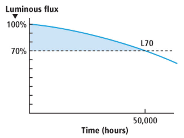 ASSIST(Alliance for Solid-State Illumination Systems and Technologies)는 LED의 수명을 말한 는데 두 가지 기준을 권고하고 있습니다. 바로 L50과 L70입니다. 간단하기 말하자면 초기 LED가 가진 광속의 70% 수준으로 광속이 감소할 때 까지 경과된 시간을 L70이라하고, 50%까지 감소하는데 걸린 시간을 L50이라고 합니다. 일반적으로 인테리어나 데코레이션 분야에서는 L50을 사용하고 생활에 필요한 일반조명은 L70을 적용합니다. 요즘은 좀더 전문적인 분야에서 L80,L90을 사용하기도 합니다.