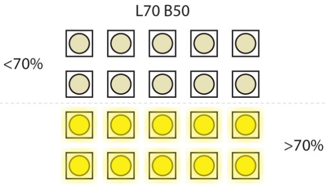 LED 수명을 나타내는 또다른 기준으로 B50과 B10을 사용합니다. B50은 광원의 테스트 샘플 중 기준을 통과하지 못하는 수량이 50%이하라는 것이고, B10은 10%가 기준이하라는 것입니다. 그래서 LED 수명을 말하면서 일반적으로 (B50,L70)를 많이 사용합니다. 예를 들어 lumen maintenance 50,000시간 (B50, L70)이라면 50,000시간을 사용한 장비를 테스트하여 초기 광속의 70% 밝기로 떨어지는 경우가 50% 이하라는 것을 의미합니다.