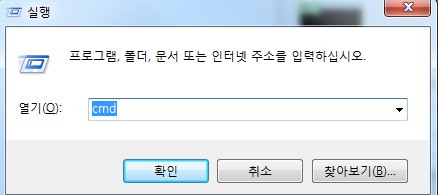 명령어 프롬프트(CMD)실행하는 방법은 두가지가 있습니다. 첫번째 방법은 윈도우 창을 누르고 [ 시작 프로그램 -> 모든 프로그램 -> 보조프로그램 -> 명령 프롬프트 실행]을 차례대로 누르면 명령어 프롬프트(CMD) 창이 나타나게 됩니다. 두 번째 방법은 [ 윈도우키 + R ]동시에 누르면 나타나는 실행창에서 cmd를 입력하면 동일한 결과를 얻을 수 있습니다. 명령어 프롬프트(CMD) 창은 아주 오래전 DOS 프로그램을 사용해 본 세대에게나 익숙한 검정색 바탕에 흰색 텍스트로 이루어져 있습니다.