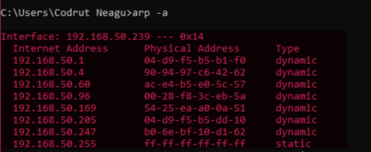같은 네트워크에 연결된 모든 디바이스를 한번에 찾아볼 수 있는 가장 좋을 방법은 “arp”명령어를 사용하는 것입니다. CMD 창에 “arp -a”를 입력하면 같은 네트워크에 연결된 디바이스의 IP 와 Mac 어드레스를 한번에 보여줍니다. IP 어드레스는 서브넷 마스크의 설정에 따라 같은 숫자로 시작되는 것을 볼 수 있습니다.