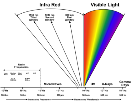 광통신에 사용되는 빛은 우리가 눈으로 볼 수 있는 가시광선 영역의 적색 바깥 파장인 적외선을 사용합니다. 광섬유를 통해서 전송될 때 감쇄가 가장 작은 파장대가 이 부분입니다. 이 파장대를 나누어 단파장대(850 nm)는 단거리나 저속전송에 사용되고 장파장대(1310 nm)는 중거리와 고속전송에 사용됩니다. 그리고 1550 nm 의 파장은 해저케이블과 같은 아주 먼 거리를 전송하는데 사용됩니다.