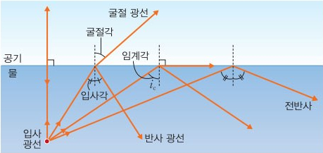 빛은 굴절하는 성질에 의해 굴절각이 큰 물질에서 작은 물질로 빛이 입사할 때, 입사각보다 굴절각이 커지게 되면 입사한 빛이 모두 반사됩니다. 이 현상을 전반사라고 합니다.