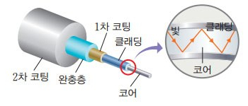 이러한 전반사의 원리를 이용한 기술이 바로 광섬유를 이용한 광통신입니다. 광섬유는 전반사 원리를 이용한 빛의 전송체입니다. 광섬유는 굴절률이 높은 매질인 코어와 낮은 매질인 클래딩으로 구성되어 있습니다. 코어를 둘러싼 클레딩은 거울과 같은 역활을 하면서 빛을 반사시키고 반사된 빛은 다시 코어로 들어갑니다. 이런 전반사가 반복되면서 빛의 속도로 전달되는 것입니다.