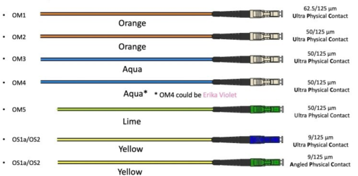 광케이블은 앞에서 설명한 특성에 따라 여러가지 종류가 있습니다. 색상으로 구분하자면 싱글모드는 노란색, 멀티모드는 주황색을 주로 사용합니다. 그리고 코어의 두께와 대역폭에 따라 종류가 나누어집니다.