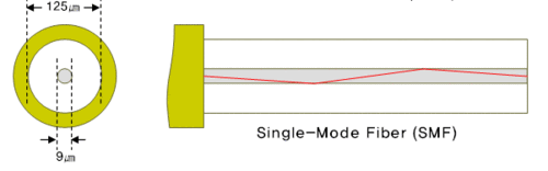 광케이블은 일반적으로 용도에 따라 ‘싱글모드’와’ 멀티모드’ 두 가지 규격으로 나누어집니다. 싱글모드는 직경이 8~10um로 머리카락의 1/5도 안될 정도로 가는 코어로 이루어져 있습니다. 코어의 직경이 작아지고 굴절율을 적게하여 하나의 빛으로 전달하게 됩니다. 광원도 직진성이 좋은 레이저 광원을 사용합니다. 멀티모드에 비해 전송손실이 적고 장거리 통신에 많이 사용됩니다.