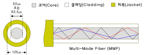 멀티모드는 직경이 50 또는 62.5um인 코어를 사용하여 내부를 통과하는 빛이 여러 경로라는 특징이 있습니다. 코어의 직경이 크기때문에 빛이 분산되어 여러 경로로 전달됩니다. 멀티모드에 주로 사용되는 광원은 확산되는 성질을 가진 LED를 사용합니다. 싱글모드에 비해서 가격이 싸고 취급이 용이한 장점이 있습니다.