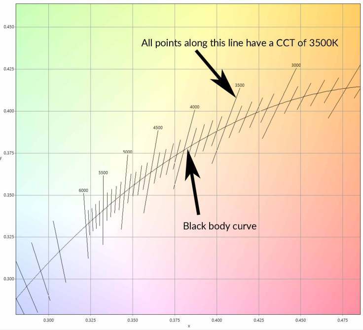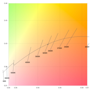 실제로 위의 CIE1931의 흑체곡선을 보면 동일 색온도가 사선으로 표시된 것을 볼 수 있습니다. 동일한 3500K이지만 흑체곡선상의 백색을 중심으로 위쪽으로는 Green을 포함한 3500K이 존재하고 아래쪽으로는 Mazenta의 영향을 받습니다.